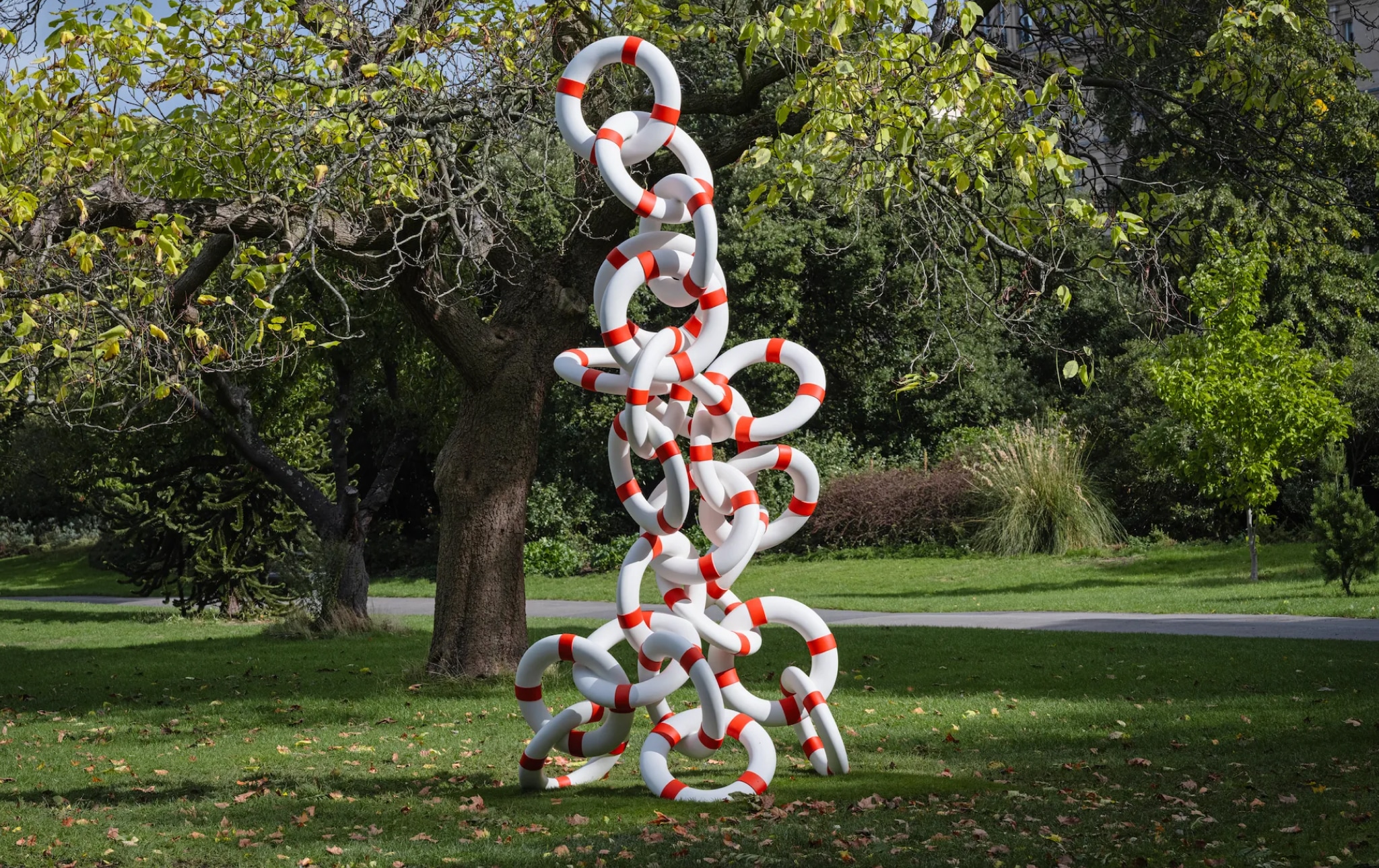 Among the confirmed installations, Elmgreen & Dragset’s monumental Life Rings, Fig.3 arrives courtesy of Pace, an uncanny tower of life-saving rings that reads at once as satire and civic monument, throwing questions about safety, visibility and spectacle into the park’s green interior. Nearby, Assemble’s Fibredog, a large, processional piece made in collaboration with UniFor and Plinth, places a community-minded practice in the public realm, inviting participation and reflection on material heritage. These two works alone set the tone for a sculpture programme that is neither quaint nor merely decorative; it is conversational, challenging, and wholly public.